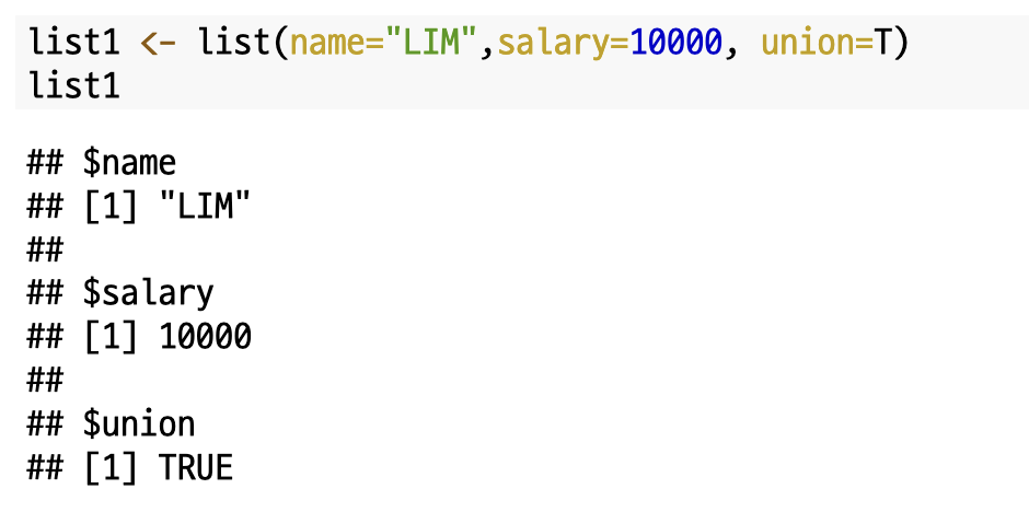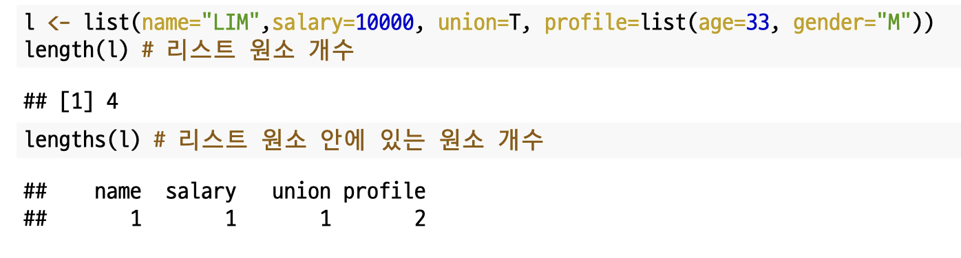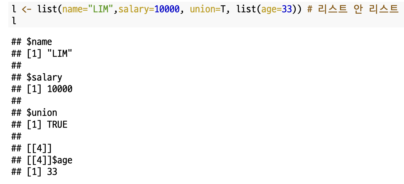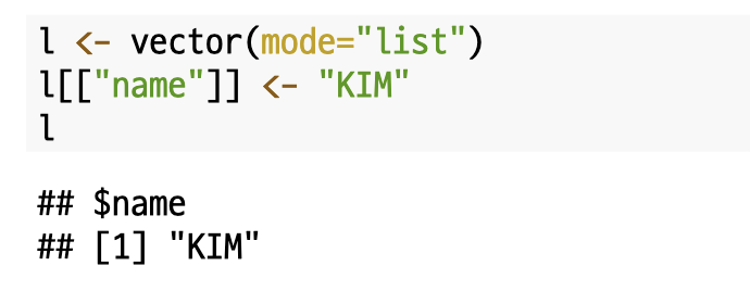 여기서 흥미로운 사실은 리스트도 벡터의 모드(행렬, 배열...) 중 하나로 `vector()`를 통해서도 리스트를 생성할 수 있다는 것입니다.