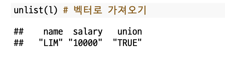`unlist()`을 이용하면 리스트를 벡터로 가져올 수 있습니다.