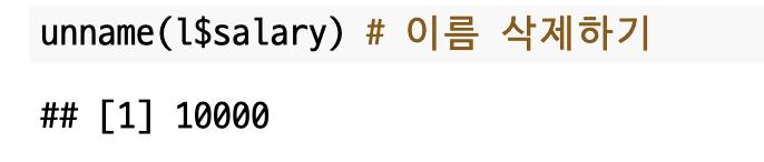 추가로 `unname()`을 이용하면 리스트의 이름을 삭제할 수 있습니다.