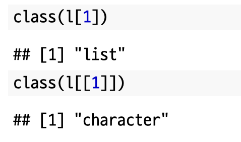 차이점을 눈치채셨나요? `[]`을 이용한 경우에는 list로 반환된다는 점입니다. 참고로 `[[]]`는 벡터로 반환됩니다.