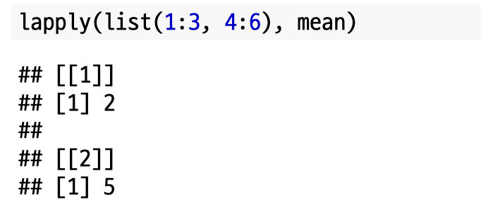 `lapply()`를 이용해 리스트 원소의 평균 값을 구했습니다. 반환 값은 리스트(list)입니다.