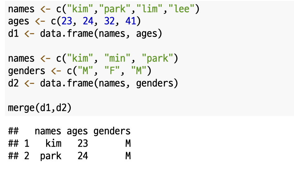 두 데이터 프레임을 합칠 때 자동으로 공통되는 열의 이름을 기준으로 합칠 수 있습니다.