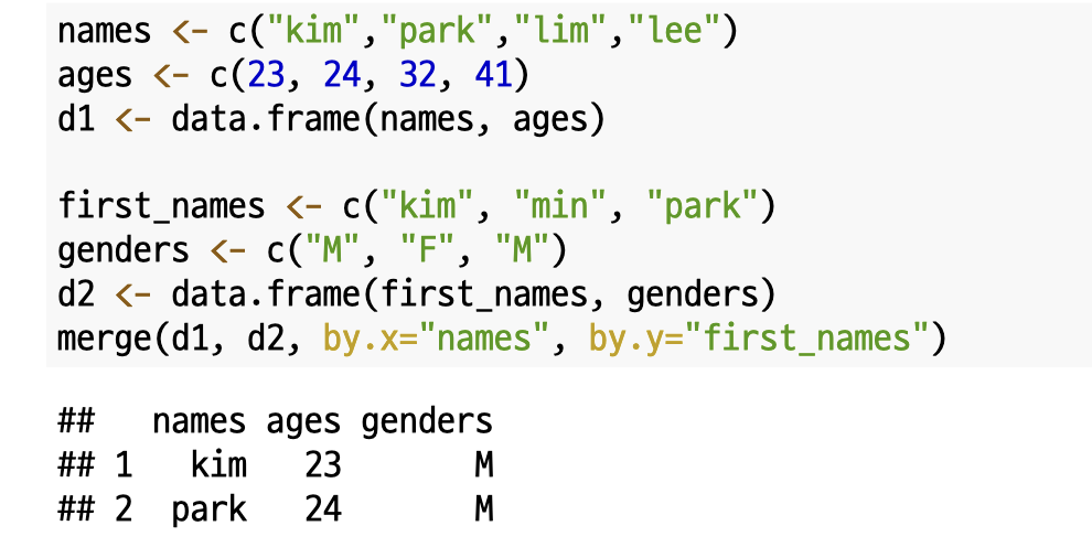 외부 데이터들을 모아 데이터 프레임을 합칠때 내용은 같지만 이름은 다른 경우가 존재할 수 있습니다. 위 코드처럼 첫번째 데이터 프레임에서는 names 로 두번째 데이터 프레임에서는 first_names 로 두 이름이 다르지만, 내용은 같을 수도 있는데요. 이런 경우 `by.x`와 `by.y`를 통해 명시적으로 같은 열임을 설정할 수 있습니다.