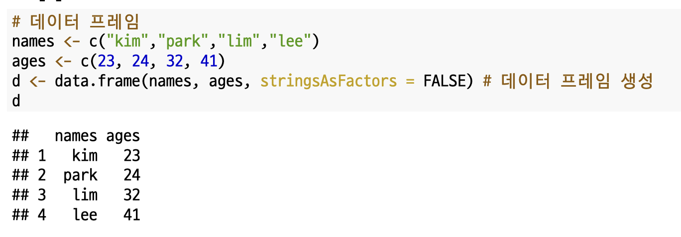 `data.frame()`을 이용하여 데이터 프레임을 생성할 수 있습니다.