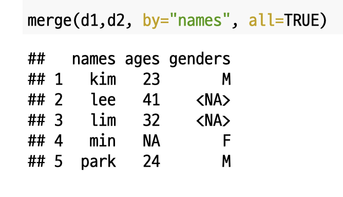 `by`를 통해 병합할때 기준이 되는 열을 선택할 수 있습니다. 또한, `all=TRUE`를 이용해 값이 없는 부분은 NA로 처리하여 모든 행을 합칠 수 있습니다.