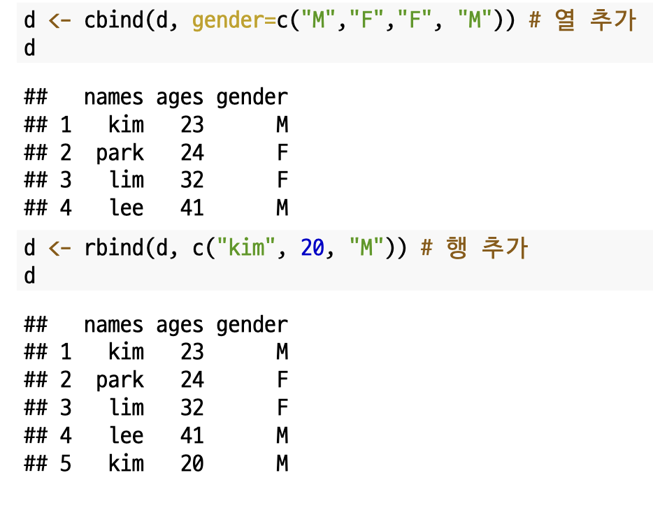데이터 프레임에서도 `cbind()`, `rbind()`를 이용하여 데이터를 추가할 수 있습니다.