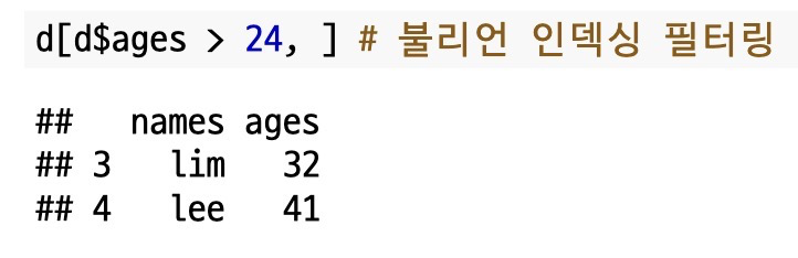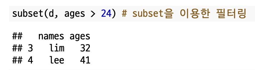 불리언 인덱싱 말고도 `subset()`을 이용하여 데이터 프레임을 필터링할 수 있습니다.