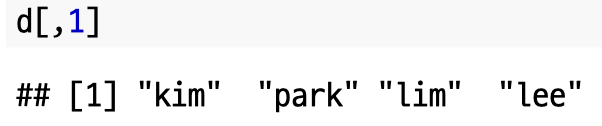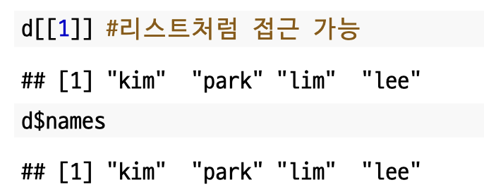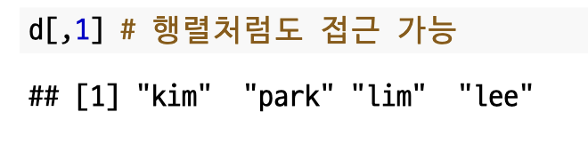 데이터 프레임에서의 데이터 접근 방법도 리스트와 동일합니다.