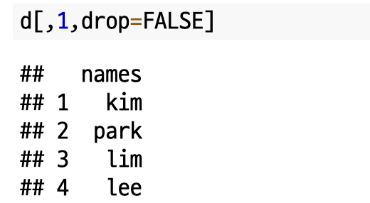 행렬에서와 마찬가지로 drop=FALSE를 통해 단일 행 / 열을 가지는 데이터 프레임으로 유지할 수 있습니다.