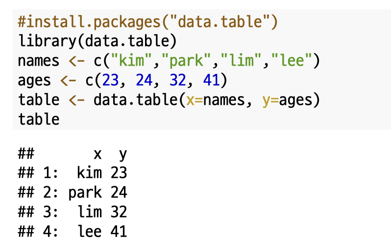 데이터 테이블에 대해서도 간단히 알아보겠습니다. 데이터 프레임을 대신하여 `데이터 테이블`을 이용할 수 있는데요. `데이터 테이블`은 색인을 사용하여 더 빠르게 조건 검색이 가능하고 데이터 연산이 편리한 장점을 가지고 있습니다.