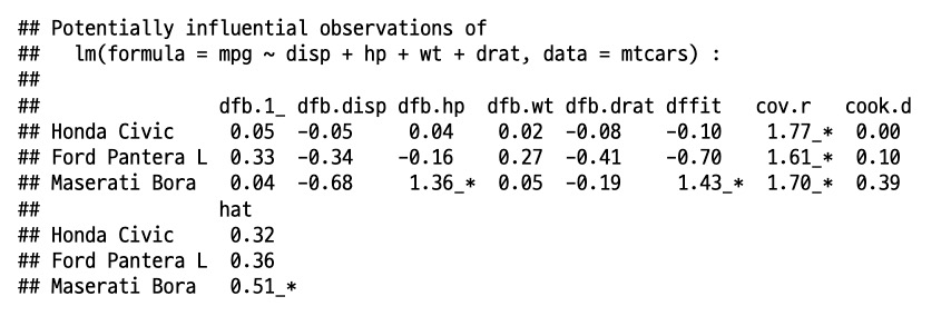 R의 `influence` 함수로 각 회귀진단 통계량에 따른 영향점을 찾을수 있습니다.