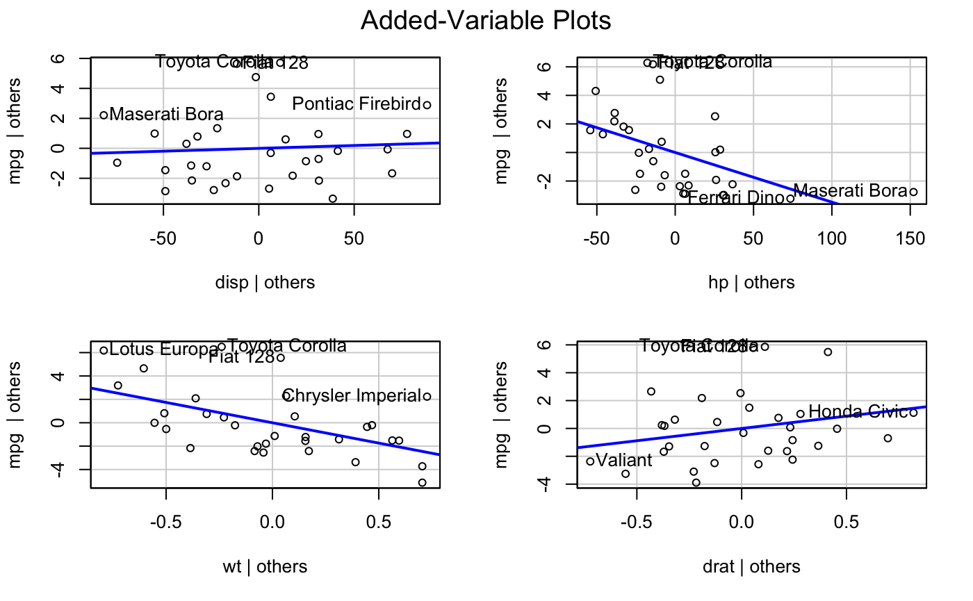 avPlots(model) # added variable plot