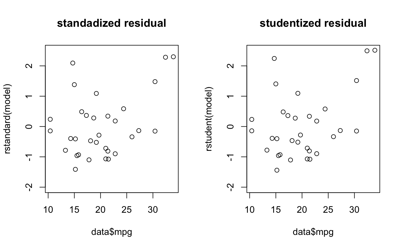plot(data$mpg, rstudent(model), ylim=c(-2,2.5), main="studentized residual") # 스튜던트화 제외잔차