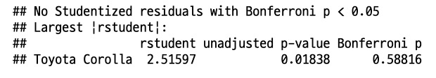 이상점은 car 라이브러리의 `outlierTest()` 로 찾을 수 있다.