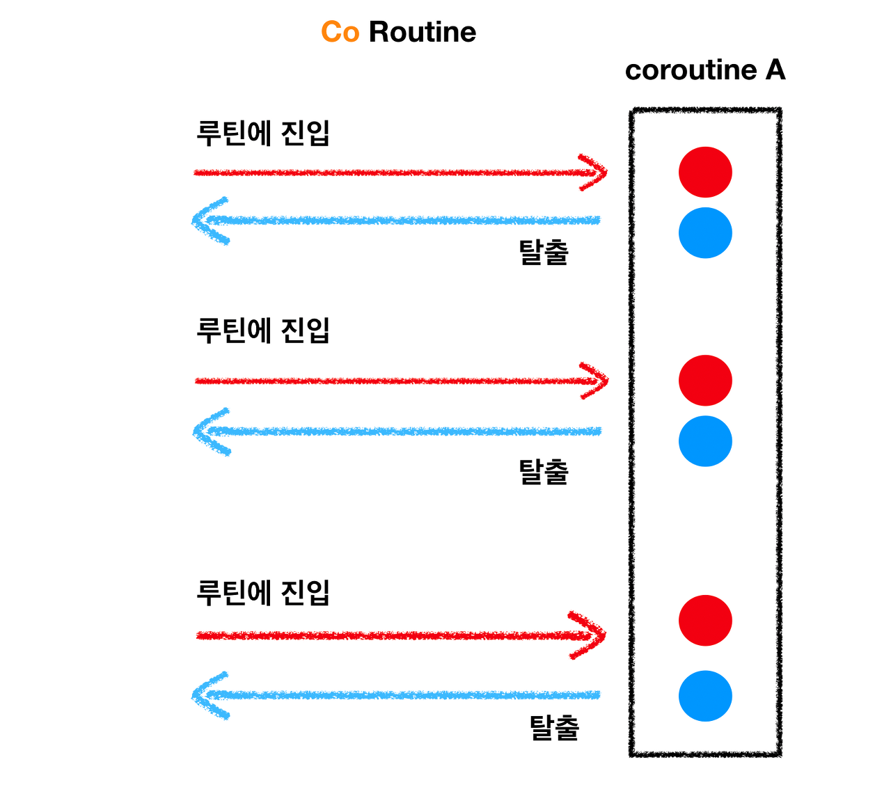 코루틴도 routine이기 때문에 하나의 함수로 생각해보자. 이 함수는 함수에 진입할 수 있는 진입점도 여러개고, 함수를 빠져나갈 수 있는 탈출점도 여러개다. 즉, 코루틴 함수는 꼭 return 문이나 마지막 닫는 괄호를 만나지 안더라도 언제든지 중간에 나갈 수 있고, 언제 든지 다시 나갔던 그 지점으로 들어올 수 있다. 아래 링크로 들어가서 예시를 보면 이해가 잘 될 것이다.